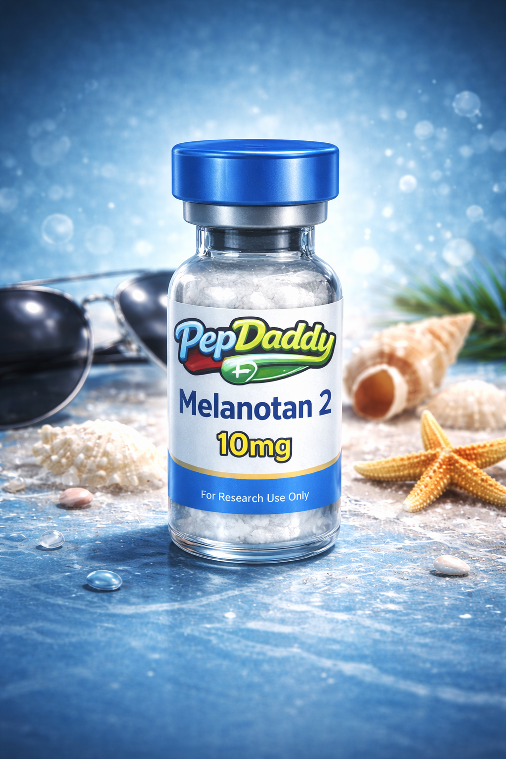 Each unit is distinctly marked “PepDaddy Melanotan 2 10mg”, allowing for quick identification and minimizing confusion in structured or high-organization environments. The typography is clean and confident, enhancing readability while preserving the product’s minimalist design language.